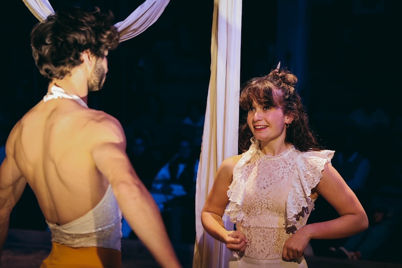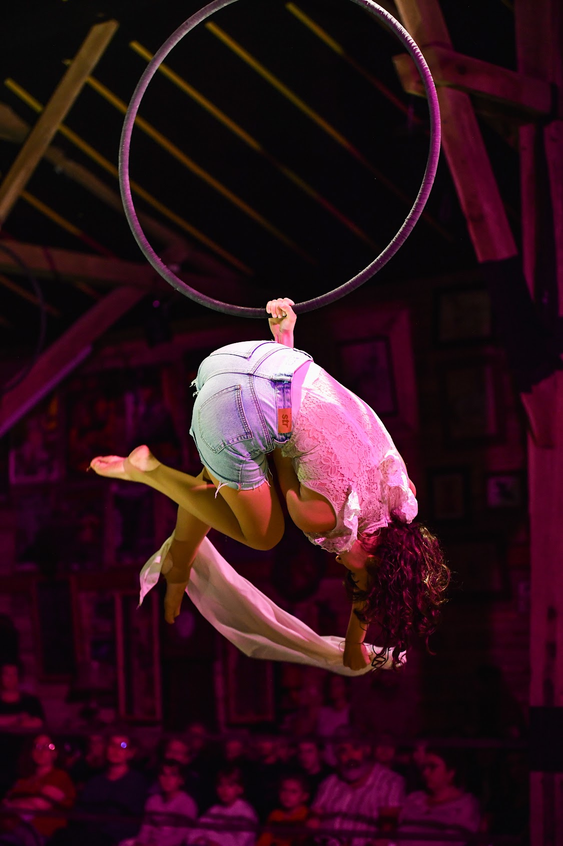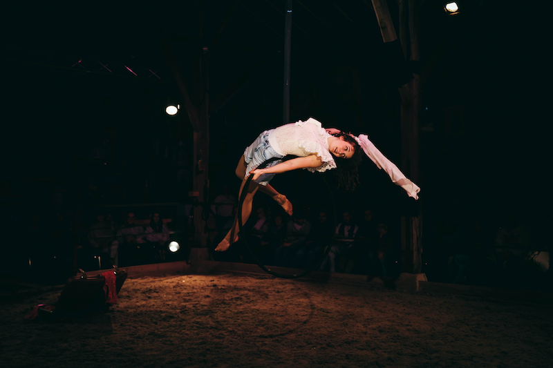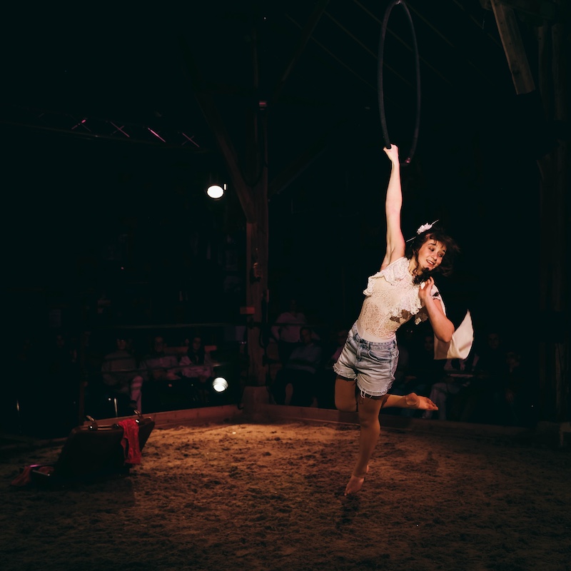 Maud se destine à l'exercice périlleux des arts du cirque. Comme son prénom l'indique, elle incarne la force de vaincre, mais avec les seules armes que sont sa grâce, son talent et son affabilité. Musicienne, danseuse, gymnaste, cavalière, elle ravit les spectateurs de nos cabarets. Le numéro de tissu et cerceau aérien qu'elle présente avec Enzia est fascinnant. Maud l'andalouse. Ici à Nemours, avec Stéphanie à cheval.